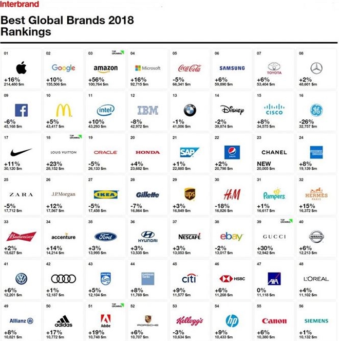Best Global Brands do InterBrand thực hiện thường niên để vinh danh các thương hiệu ở mọi lĩnh vực trên toàn cầu. Để được đánh giá, các công ty phải có ít nhất 30% doanh thu đến từ nước ngoài và dữ liệu tài chính công khai.
