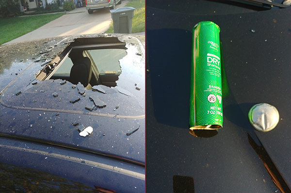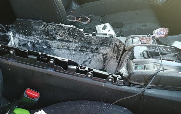 Vụ việc được Christine Debrecht (sống tại bang Missouri, Mỹ) chia sẻ vào ngày 19-9 vừa qua. Cụ thể, con gái của Christine đã để một chai dầu gội khô ở khoang chứa đồ dưới bệ tỳ tay trong chiếc Honda Civic. Không rõ chai dầu gội khô đã ở đó bao lâu nhưng tuần trước, nó đã phát nổ như một quả rocket.