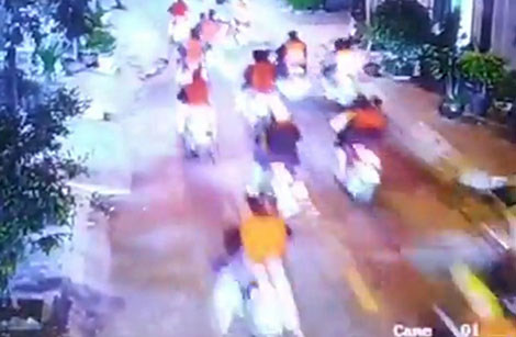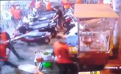 | Hình ảnh nhóm đối tượng diễu võ giương oai trên đường phố và xông vào đập phá quán ốc. |