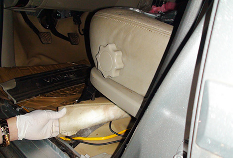 | Vết máu của nạn nhân vẫn còn đọng dưới tấm thảm chiếc xe mà Kiều Quốc Huy đem về “khoe” là mua được từ việc buôn gỗ trắc. |