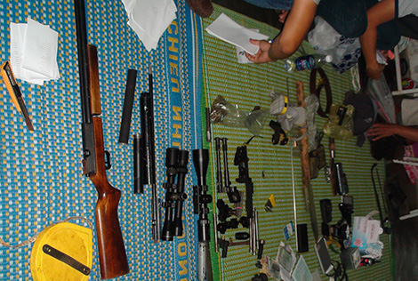 | Hiện trường “kho vũ khí” thu được ngay tại nhà nghi can Kiều Quốc Huy. |