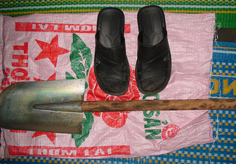 | Đôi dép của nạn nhân thu được tại sân nhà nghi can. Chiếc xẻng này được nghi can thừa nhận là sử dụng để đào hố chôn nạn nhân. |