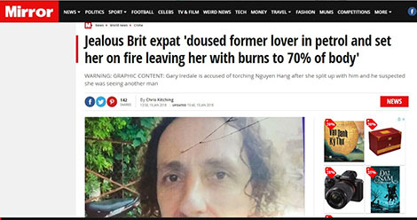 1. Đầu năm 2018, trên địa bàn quận Tây Hồ (Hà Nội) xảy ra một vụ “hỏa thiêu” gây xôn xao dư luận. Do mâu thuẫn ghen tuông, chị Nguyễn Thị H. (34 tuổi, tạm trú tại phường Phú Thượng, Tây Hồ, Hà Nội) bị bạn trai là Iredale Gary (53 tuổi, trú tại Blackpool, Vương quốc Anh) đổ xăng rồi châm lửa đốt gây bỏng nặng. Do đã mua sẵn vé máy bay từ trước nên ngay sau khi gây án, Gary đã kịp chuồn sang Bangkok (Thái Lan).