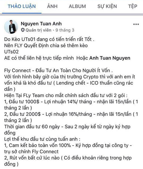 Theo tố cáo của chị H. và nhiều nhà đầu tư khác, đầu tháng 3-2018 T.A. có post bài viết huy động vốn trên Group Fly team ICO và trên Facebook cá nhân với 2 gói đầu tư 1.000 USD và 2.000 USD (tương đương gói 23 và 46 triệu đồng). Hình thức nhận tiền là chuyển khoản qua ngân hàng. Đối tượng cũng cam kết sẽ trả lãi 2 đợt/tháng và cam kết sẽ hoàn vốn 100%. T.A. cũng tuyên bố chỉ nhận tối đa 10 người tham gia, gọi đây là “thuyền 1”. Hoa mắt trước lãi suất 180-200%/năm, rất nhiều người ào ào đổ tiền vào tham gia.