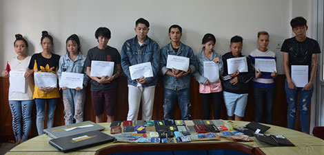 | Các đối tượng và tang vật trong đường dây “alo lừa đảo” do nhóm tội phạm Đài Loan tổ chức. |