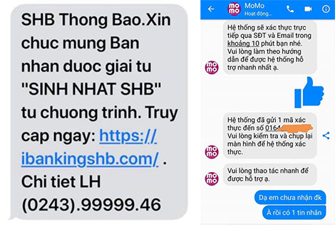 | Một tin nhắn thông báo trúng thưởng chứa đường link giả mạo Ngân hàng SHB được gửi đến khách hàng (bìa trái); Fanpage giả của một ví điện tử do đối tượng lừa đảo lập ra. |