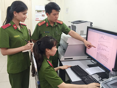 | Giám định chữ viết, chữ ký tại Phòng Kỹ thuật hình sự Công an TP Hà Nội. |