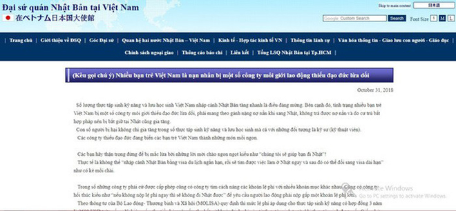 | Website đại sứ quán Nhật Bản cảnh báo người dân về hình thức lừa đảo sang Nhật lao động bằng visa du lịch. |