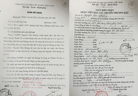 Theo yêu cầu của gia đình Hoàng, chị Hoa đặt cọc số tiền 100 triệu đồng để cầm sổ đỏ, hẹn trong vòng 3 tháng sau khi thanh toán đầy đủ, hai bên sẽ làm thủ tục mua bán chính thức và làm hợp đồng công chứng. Trong thời gian này, Nguyễn Tiến Hoàng tiếp tục đến nhà chị Hoa kể muốn bán gấp nhà đất ở ngõ 622 Minh Khai. Tin lời Hoàng nên chị Hoa đã giới thiệu cho chị Đỗ Thị Vinh gặp Hoàng để mua bán.