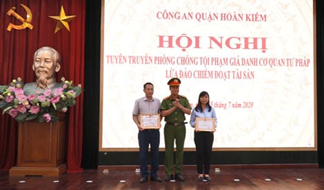 | Công an quận Hoàn Kiếm tuyên dương cán bộ ngân hàng tích cực tham gia tuyên truyền phòng, chống tội phạm. |