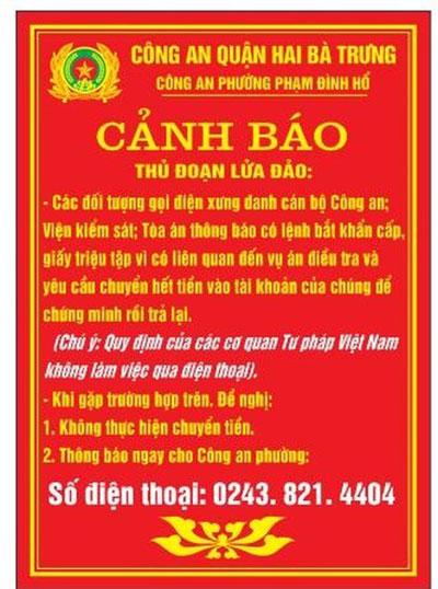 Chặn đứng nhiều vụ giả danh lừa đảo nhờ sự phối hợp của ngân hàng và Cơ quan công an Theo Đại tá Hà Mạnh Hùng, Trưởng Công an quận Hoàn Kiếm, thời gian vừa qua, nhiều vụ lừa đảo giả danh Cơ quan công an, tòa án, viện kiểm sát... xảy ra trên địa bàn quận đã bị chặn đứng nhờ sự phối hợp của ngân hàng và Cơ quan công an. “Tính đến ngày 30-5-2020, Công an quận Hoàn Kiếm đã phối hợp với các ngân hàng tổ chức đặt xong trên 700 biển cảnh báo tại 187 phòng giao dịch trên địa bàn quận. Thời gian tới, Công an quận Hoàn Kiếm sẽ tiếp tục triển khai nhiều biện pháp phòng ngừa và đấu tranh với tội phạm giả danh cơ quan tư pháp gọi điện lừa đảo chiếm đoạt tài sản của người dân, kịp thời nắm bắt phương thức thủ đoạn để thông báo cho người dân và cơ quan chức năng để phòng ngừa. Công an quận Hoàn Kiếm đề nghị các ngân hàng, phòng giao dịch ngân hàng, nhân viên giao dịch tiếp tục phối hợp chặt chẽ với công an quận trong việc đặt biển cảnh báo. Đồng thời, các ngân hàng cần nâng cao tính bảo mật thông tin của khách hàng, kiểm tra, thẩm định kỹ các giấy tờ cá nhân của người có giao dịch với ngân hàng để hạn chế, không để xảy ra các vụ lừa đảo ngân hàng chiếm đoạt tài sản” - Đại tá Hùng chia sẻ. |