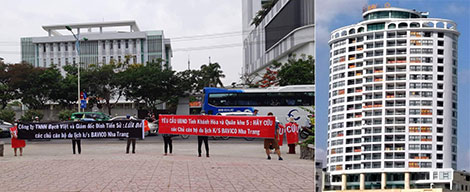 | Nhà đầu tư căng băng-rôn kêu cứu tại Dự án Bavico Nha Trang. |