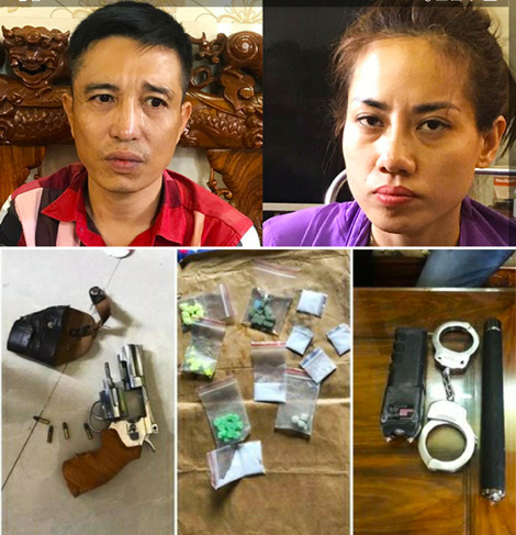 | Cặp vợ chồng chuyên cho vay lãi nặng Hùng – Vân (ảnh trên). Ma túy, súng, còng số 8 thu giữ tại nơi ở của vợ chồng Hùng. |