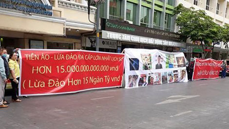 | Người bị hại căng băng rôn tố cáo vụ việc lừa đảo 15.000 tỷ tại TP Hồ Chí Minh. |