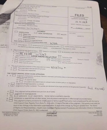 Tòa Thượng thẩm Califonia đã thụ lý đơn, đã 3 lần đưa ra xét xử nhưng luật sư phía bà Ngọc đều xin hoãn, trước khi tuyên “vô hiệu” hôn thú của bà Ngọc với ông Thái. Theo Tòa án California, Chi nhánh Tư pháp Califorlia diễn giải “sự vô hiệu của cuộc hôn nhân hoặc sự vô hiệu của một mối quan hệ kết đôi chung sống như gia đình” bằng 3 từ ngắn gọn là “sự hủy bỏ”. Nó có hiệu lực là khi tòa án tuyên bố rằng: “cuộc hôn nhân của bạn hoặc mối quan hệ kết đôi chung sống như gia đình không còn giá trị pháp lý nữa. Sau khi tuyên bố hủy, cuộc hôn nhân của bạn hoặc mối quan hệ kết đôi chung sống như gia đình không bao giờ xảy ra vì nó đã không còn hợp pháp”.