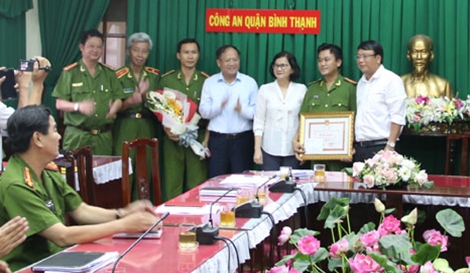 | Phó Tí thư Thường trực thành ủy TP Hồ Chí Minh, ông Tất Thành Cang trao bằng khen và động viên Công an quận Bình Thạnh. |