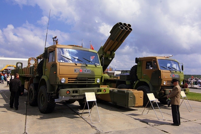 | Hệ thống pháo phản lực phóng loạt 9A52-4 Tornado tại một cuộc triển lãm. |