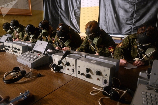 | Một nữ sĩ quan xinh đẹp như "Hoa hồng Nga" đang điều hành trạm vô tuyến của Tiểu đoàn Tên lửa ở khu vực Novosibirk |