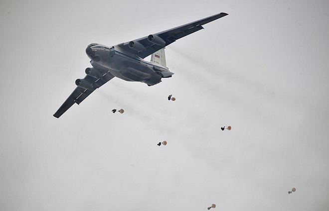 | Lính dù Nga nhảy ra khỏi một chiếc vận tải cơ Il-76. Ảnh: TASS |