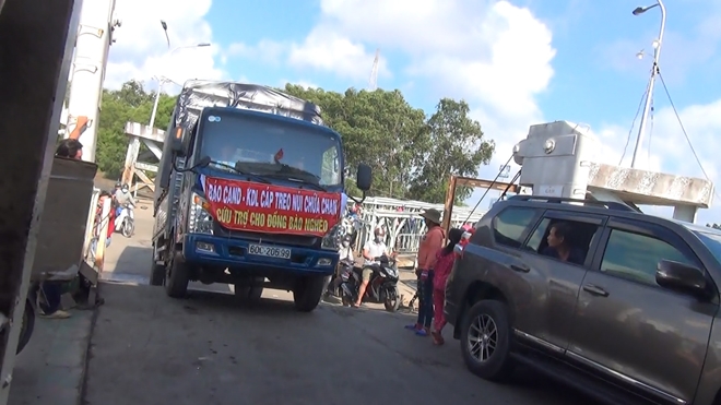 Trên phà từ thị xã Gò Công vượt sông Tiền sang huyện cù lao Tân Phú Đông, chúng tôi gặp đoàn công tác Công an tỉnh Tiền Giang do Đại tá Nguyễn Văn Ngươn, Trưởng phòng Công tác chính trị Công an tỉnh làm trưởng đoàn cũng đang trên đường về cù lao cùng tặng quà cho bà con theo như kế hoạch đã thống nhất trước. Đại tá Nguyễn Văn Ngươn cho biết, Phú Tân nằm cách phà qua cù lao này khoảng 17km. Đây là xã anh hùng, đời sống phần đông người dân còn nhiều khó khăn. “Lãnh đạo và bà con địa phương phấn khởi lắm khi nghe Báo CAND cùng Mạnh thường quân gác chuyện nghỉ lễ 30-4 và 1-5 không ngại đường xa về đây cùng Công an địa phương tặng quà cho bà con nghèo. Huyện cũng vừa kỷ niệm 10 năm ngày thành lập huyện nên hoạt động tặng quà này càng thêm ý nghĩa”, Đại tá Nguyễn Văn Ngươn nói.