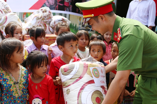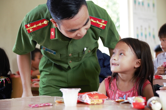 | Tuổi trẻ Trường Trung cấp Cảnh sát Vũ trang trao quà, thăm hỏi và động viên các em nhỏ. |