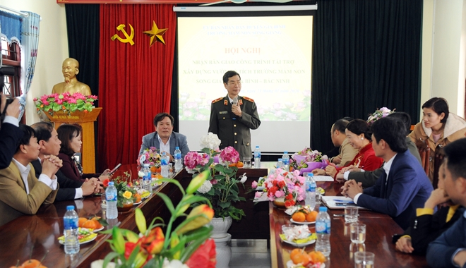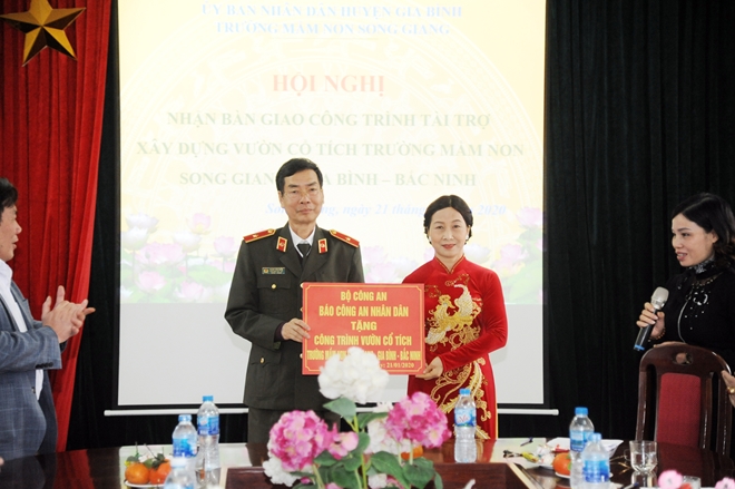 Tại buổi lễ trao công trình, Thiếu tướng Phạm Văn Miên, Tổng Biên tập Báo CAND cho biết, bản thân rất vinh dự khi đại diện cho lãnh đạo đơn vị, những người làm Báo CAND nhiều lần được cùng các nhà tài trợ về Song Giang, một quê hương giàu truyền thống cách mạng, là xã Anh hùng lực lượng vũ trang nhân dân. Được biết, nhiều năm qua, với sự quan tâm, hỗ trợ của lãnh đạo các cấp, chính quyền, Công an huyện Gia Bình, trường mầm non xã Song Giang đã có nhiều đổi mới, tuy nhiên vẫn còn khó khăn. Hy vọng “công trình vườn cổ tích”, món quà nhỏ là tấm chân tình của những người làm Báo CAND và các nhà hảo sẽ góp phần tạo một sân chơi bổ ích, thỏa mãn nhu cầu vui chơi và hoạt động của trẻ, thông qua đó, nhân cách của trẻ được hình thành và phát triển toàn diện…