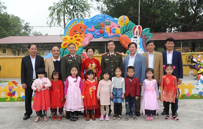 | Thiếu tướng Phạm Văn Miên, Tổng Biên tập Báo CAND tặng "công trình vườn cổ tích" tặng trường mầm non xã Song Giang. |