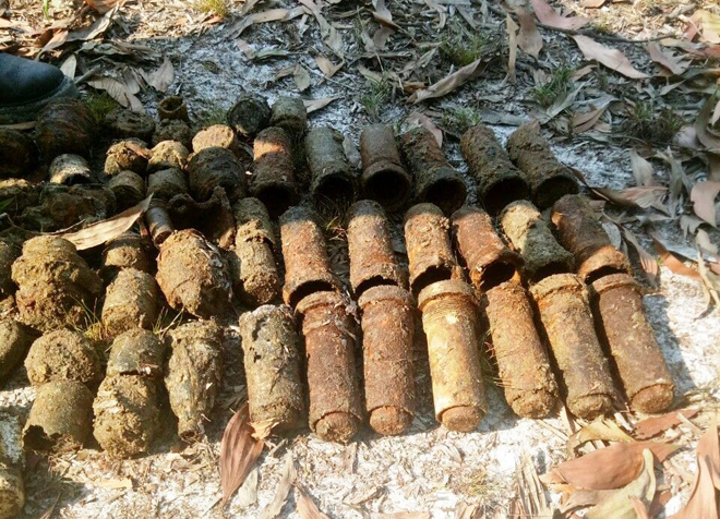 | 85 quả đạn pháo còn nguyên ngòi nổ nằm gần khu dân cư. |