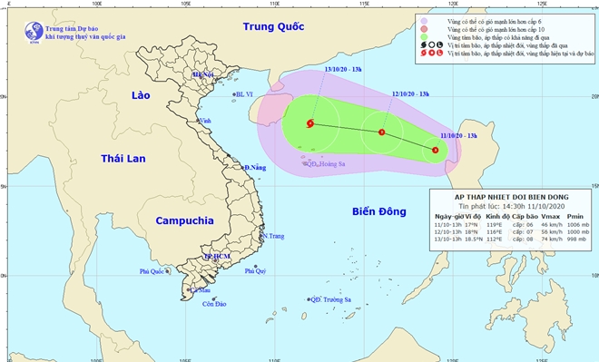 Dự báo trong 24 giờ tới, áp thấp nhiệt đới di chuyển theo hướng Tây Tây Bắc, mỗi giờ đi được khoảng 10 km và có khả năng mạnh thêm. Đến 13h ngày 12/10, vị trí tâm áp thấp nhiệt đới ở khoảng 18,0 độ Vĩ Bắc; 116,0 độ Kinh Đông, cách quần đảo Hoàng Sa khoảng 450 km về phía Đông Đông Bắc. Sức gió mạnh nhất vùng gần tâm áp thấp nhiệt đới mạnh cấp 7 (50-60 km/giờ), giật cấp 9.