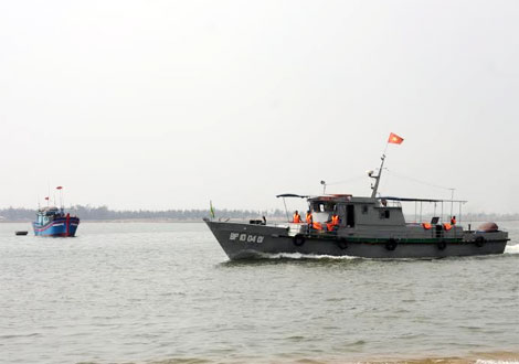 | Tàu cứu nạn - cứu hộ của Bộ đội biên phòng Phú Yên hướng dẫn tàu thuyền ngư dân vào cửa sông Đà Diễn neo đậu tránh bão. |