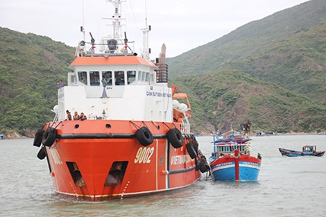 | Tàu Cảnh sát biển 9002, Hải đội 201 lai dắt tàu cá QNg 97299 - TS và 10 ngư dân về đất liền. |