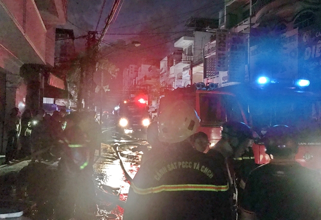 | Cảnh sát PCCC tiếp cận căn nhà 4 tầng là hiện trường vụ cháy. |