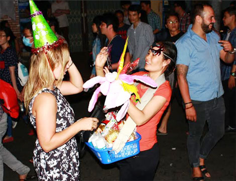 Ở khu phố Tây Phạm Ngũ Lão, không khí đón tết của những du khách nước ngoài cũng không kém phần cuồng nhiệt…