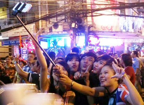 Một nhóm bạn trẻ tại khu phố tây cùng nhau chụp hình lưu giữ khoảnh khắc năm cũ bước sang năm mới.