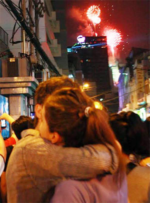 Phố Tây Phạm Ngũ Lão (TPHCM), trong thời khắc đón chào năm mới, hai du khách nước ngoài vừa ngắm pháo hoa vừa trao cho nhau nụ hôn đầu năm.