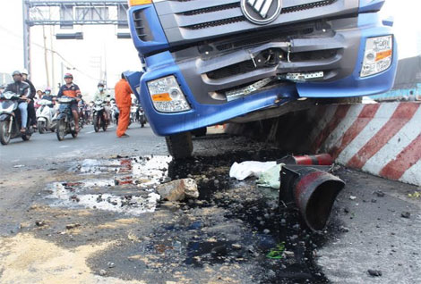 Tại hiện trường hơn 10m dải phân cách bị phá hỏng, đầu và gầm xe container bị biến dạng, nhớt từ trên xe chảy ra đường lênh láng. Theo tài xế Vạn, lúc điều khiển xe đến khu vực này thì tài xế Vạn ngủ gật nên gây ra vụ việc trên.