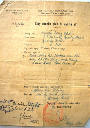 | Giấy chuyển giao di vật của liệt sỹ Nguyễn Lương Thầm do Tổng cục Chính sách, Bộ Quốc phòng bàn giao cho gia đình liệt sỹ. |