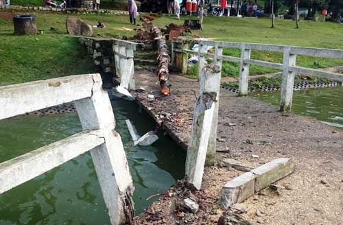 | Cây thông bên bờ hồ Xuân Hương gãy đổ, vị trí này ban ngày rất đông người đứng chụp hình. |