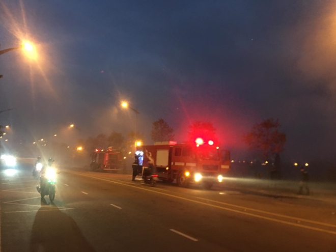 | Đến tối các xe chữa cháy vẫn túc trực để dập lửa tàn |