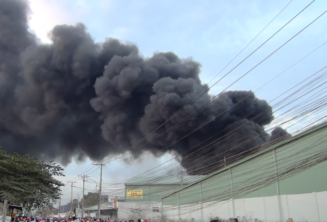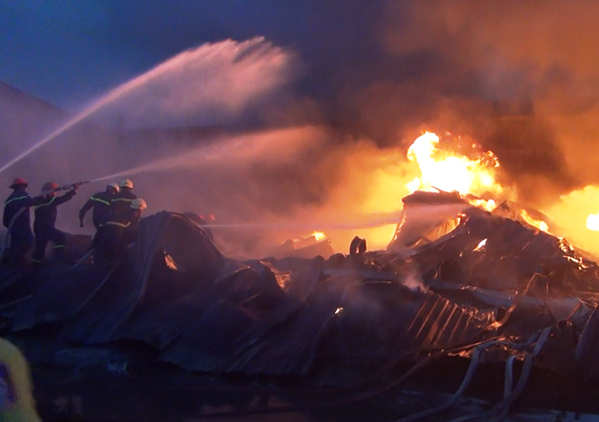 Đám cháy lan rộng ra diện tích hơn 2.000m2, các chiến sĩ chữa cháy phối hợp triển khai vòi rồng theo nhiều hướng nhằm cô lập không cho đám cháy lan rộng sáng các phân xưởng khác và các công ty kế bên.