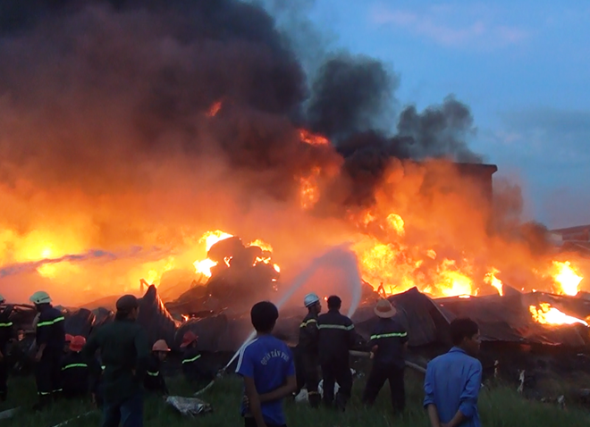 Ba xe chữa cháy của một công ty tư nhân đã đến hiện trường phun nước dập lửa nhưng ngọn lửa đã bén vào các vật dụng dễ cháy như keo, nhựa giấy nên không thể khống chế.