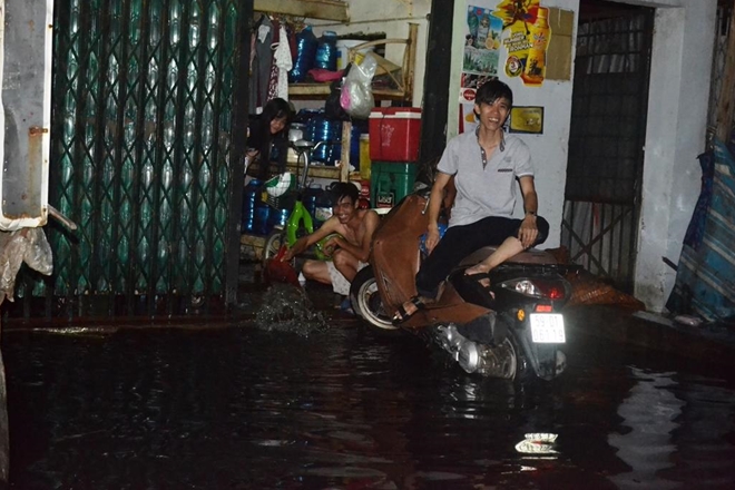 Tại khu vực đường Tô Ngọc Vân (đoạn gần cầu bà The), nước tràn vào hàng chục dãy nhà trọ khiến nhiều người suốt đêm mất ngủ di dời tài sản và tát nước.