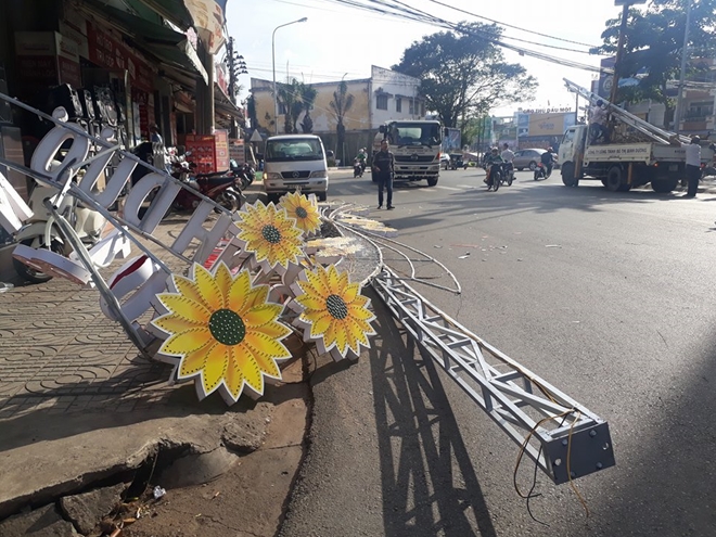 Tại hiện trường, công trình đèn hoa được thiết kế bằng nhiều khung sắt thép dài khoảng 50 mét, bắc ngang qua khu vực đường Trần Hưng Đạo, gần khu vực vòng xoay ngã 6 TP Thủ Dầu Một bị đổ, nằm ngổn ngang giữa đường; nhiều khung sắt bị bung mối hàn, ốc vít cố định trụ sắt bị rơi ra ngoài.