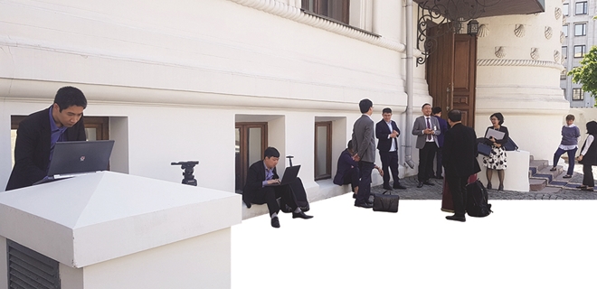 Bao giờ cũng vậy, với ưu thế chủ nhà, các phóng viên ảnh, quay phim của các hãng thông tấn, truyền hình Nga được ưu ái đặt máy ở vị trí đẹp nhất, chính giữa khuôn hình. Bởi thế, để có được những thước phim, tấm hình cân đối là một thử thách lớn với đội phóng viên đến từ Việt Nam khi diện tích tác nghiệp hạn hẹp, không được phép đặt ghế, xếp thang trong phòng họp báo.
