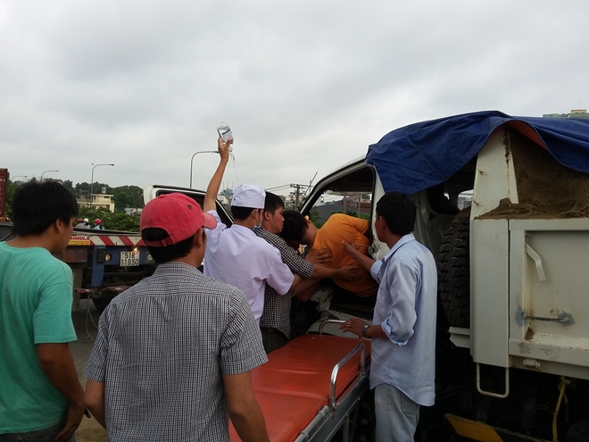 Sau va chạm, cabin xe tải bẹp dúm, tài xế bị mắc kẹt bên trong. Hàng chục người đã tiến hành phá cửa đưa tài xế ra ngoài.