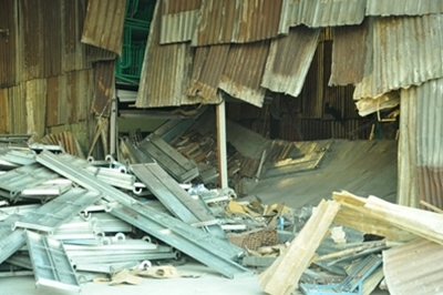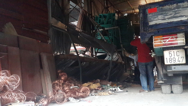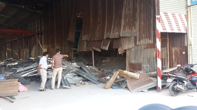 Bức vách bằng tôn của một cửa hàng kế bên sau sự cố bị giàn giáo đâm thủng, nhiều bộ giàn giáo rơi qua phía cửa hàng này.