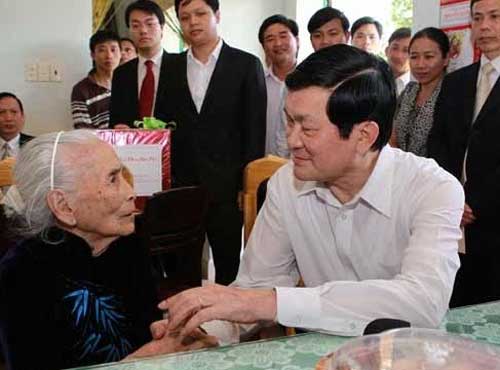 | Đảng và Nhà nước luôn quan tâm, chăm lo cho những người có công với Cách mạng. Ảnh: Chủ tịch nước Trương Tấn Sang thăm, tặng quà người có công với Cách mạng. |