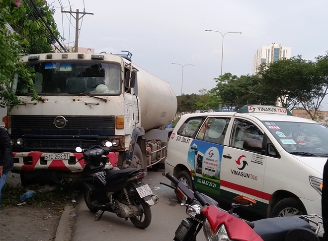 Khi qua khỏi cầu vượt Sóng Thần khoảng 300m thuộc phường Bình Chiểu, quận Thủ Đức, TP Hồ Chí Minh, xe bồn chở xăng được cho là mất lái tông thẳng vào đuôi xe taxi BKS 51F-264.57 đang lưu thông cùng chiều phía trước.