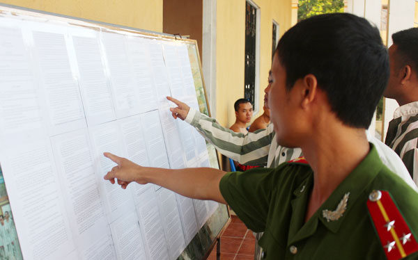 | Cán bộ Trại giam Thanh Lâm hướng dẫn phạm nhân tìm hiểu tiêu chí đặc xá năm 2015. |