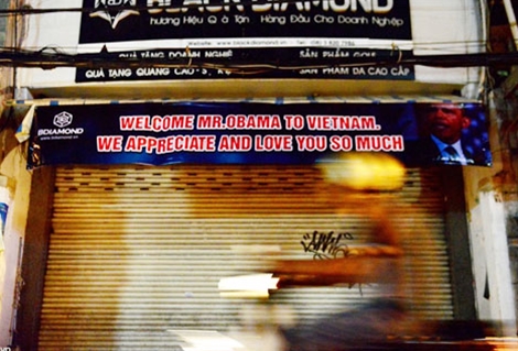 | Một tấm áp phích dài khoảng 5 m, cao 3 m được treo trên đường Mai Thị Lựu (quận 1) đối diện chùa Ngọc Hoàng - nơi Tổng thống Obama dự kiến đến thăm vào chiều nay. |